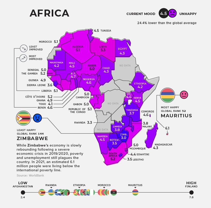 Με περιφερειακή βαθμολογία 4,5, η Αφρική κατατάσσεται ως η πιο δυστυχισμένη περιοχή παγκοσμίως. Η Ζιμπάμπουε παραμένει η πιο δυστυχισμένη χώρα στην περιοχή, καθώς συνεχίζει να παλεύει με υψηλά επίπεδα φτώχειας. Το 2021, περίπου 6,1 εκατομμύρια άνθρωποι ζούσαν κάτω από το διεθνές όριο της φτώχειας.