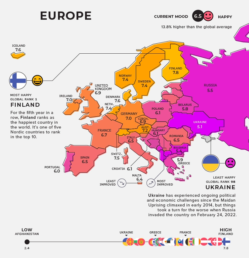 Η Ουκρανία κατατάσσεται στην τελευταία θέση, καθιστώντας την την πιο δυστυχισμένη χώρα στην Ευρώπη. Η Ουκρανία αντιμετώπισε συνεχείς προκλήσεις από τότε που κορυφώθηκε η Εξέγερση του Μαϊντάν το 2014, με αποκορύφωμα την πλήρους κλίμακας εισβολή της Ρωσίας στην Ουκρανία στις 24 Φεβρουαρίου 2022. Ως αποτέλεσμα του πολέμου, 3,5 εκατομμύρια άνθρωποι έχουν ήδη εγκαταλείψει τη χώρα.