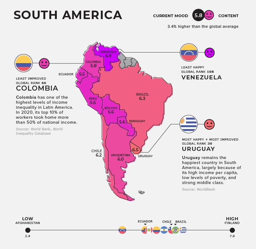 Η Ουρουγουάη διατηρεί την πρώτη της θέση ως η πιο ευτυχισμένη χώρα στη Νότια Αμερική. Συνεχίζει να κατατάσσεται ψηλά στη λίστα λόγω του υψηλού κατά κεφαλήν εισοδήματός της, των σχετικά χαμηλών επιπέδων φτώχειας και της ισχυρής μεσαίας τάξης.