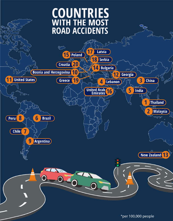 Σύμφωνα με την έρευνα, στην Ταϊλάνδη είναι πιο πιθανό να βρείτε τους χειρότερους οδηγούς, χάρη στην πολύ χαμηλή βαθμολογία του δείκτη 2,17 στα πέντε. Η χώρα έχει μακράν τον υψηλότερο αριθμό τραγικών θανάτων από τροχαίο τραυματισμό, με 32 ανά 100.000 κατοίκους.