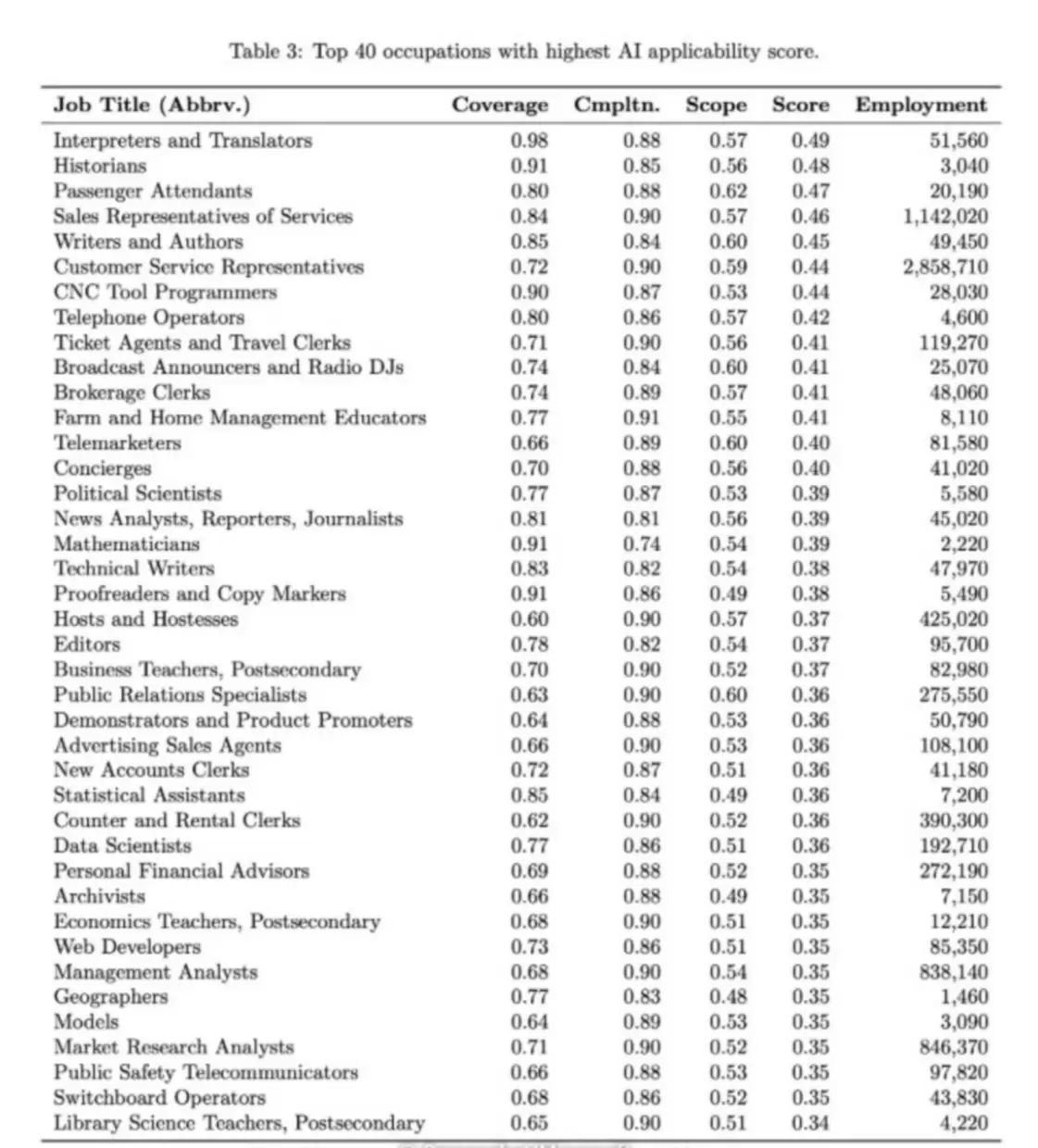 Συνολικά, τα επαγγέλματα που είναι περισσότερο εκτεθειμένα είναι εκείνα που περιλαμβάνουν γνωστική εργασία, όπως υπολογιστές, μαθηματικά ή διοικητικά καθήκοντα γραφείου, σύμφωνα με την έρευνα. Οι πωλήσεις επίσης βρίσκονται ψηλά στη λίστα, επειδή συνήθως περιλαμβάνουν παρουσίαση και εξήγηση πληροφοριών.