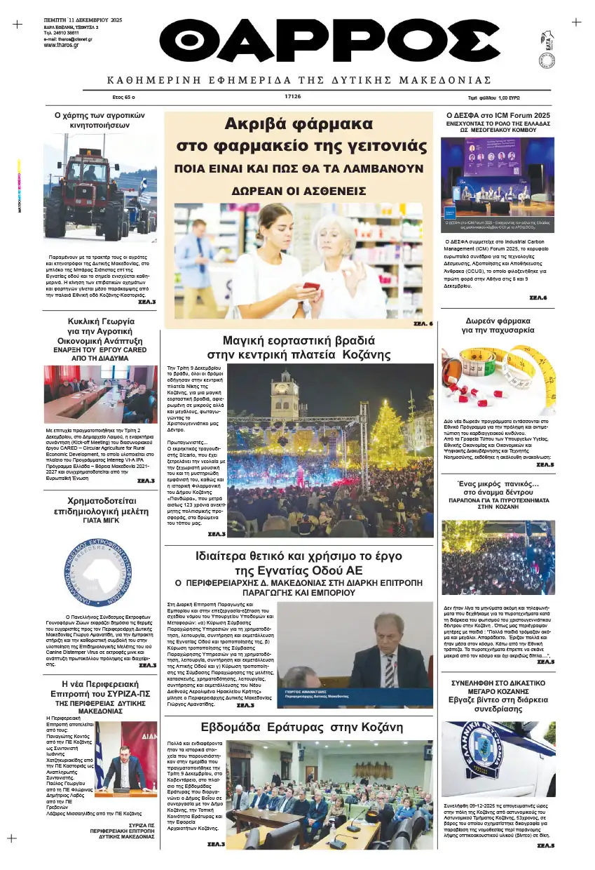 Το πρωτοσέλιδο της εφημερίδας Θάρρος για την Πέμπτη, 11 2025