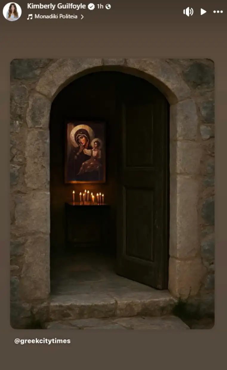 Η δεύτερη ανάρτηση, επίσης μια αναπαραγωγή από άλλο λογαριασμό, εικονίζει αναμμένα κεριά σε μια παλιά, πέτρινη εκκλησία και μια εικόνα της Παναγίας βρεφοκρατούσας, ενώ ψάλλεται ο ύμνος προς την «Παναγία Θεοτόκε»