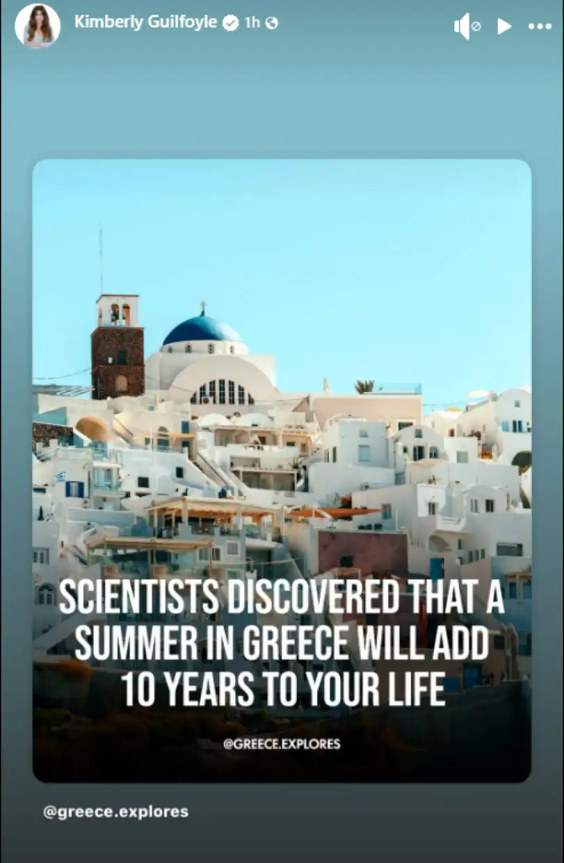 Η πρώτη είναι μια αναπαραγωγή από άλλο λογαριασμό με το μήνυμα ότι «οι επιστήμονες ανακάλυψαν ότι ένα καλοκαίρι στην Ελλάδα δίνει στη ζωή σου επιπλέον 10 χρόνια». Φαίνεται ένα νησί με λευκά σπίτια και μια εκκλησία.