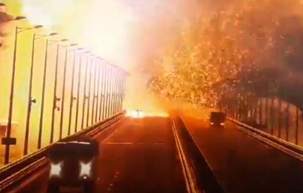Βίντεο που έχουν αναρτηθεί στα μέσα κοινωνικής δικτύωσης και τα οποία αναπαράγουν και τα ρωσικά ΜΜΕ, δείχνουν τη στιγμή που ένα φορτηγό ανατινάζεται στη γέφυρα του Κερτς.