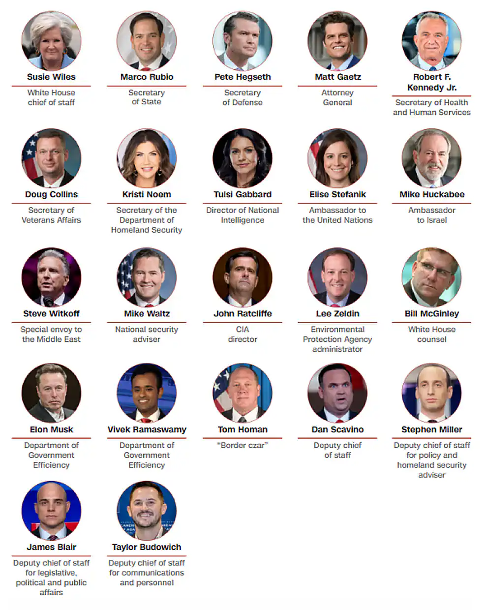 Ο κατάλογος των κυριότερων προσωπικοτήτων που έχει ανακοινώσει ως αυτό το στάδιο ο Ρεπουμπλικάνος εκλεγμένος πρόεδρος των ΗΠΑ ότι θα αναλάβουν θέσεις στην κυβέρνηση