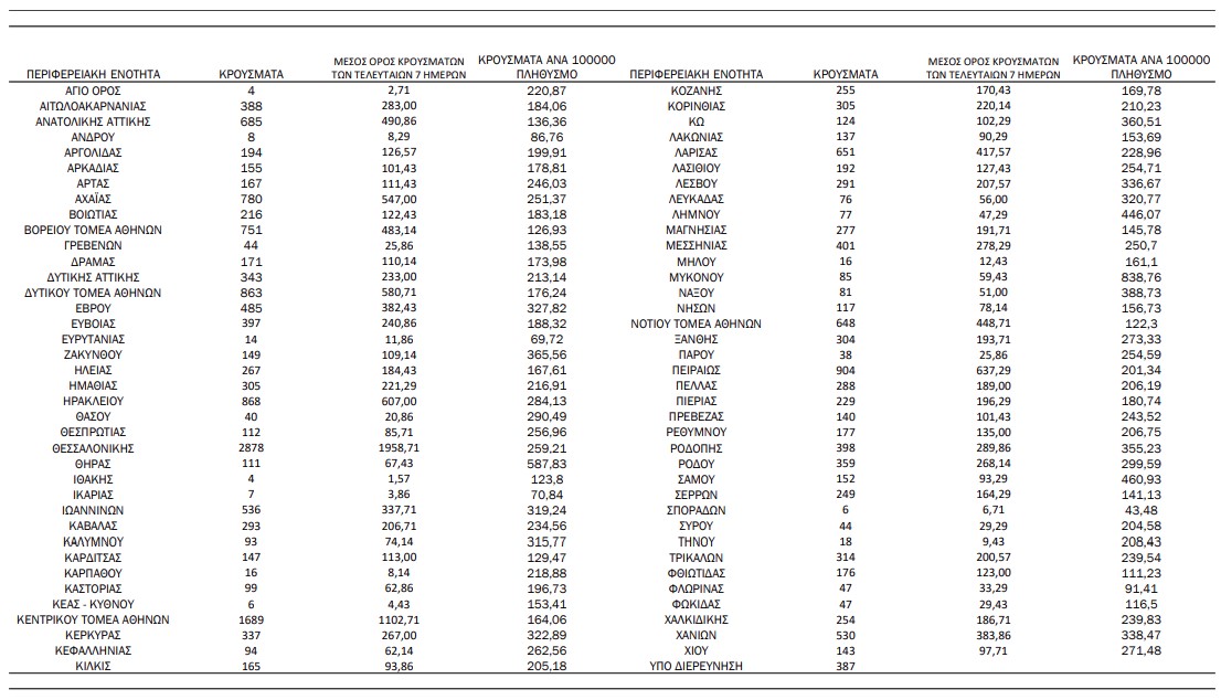 Με βάση τα επιβεβαιωμένα κρούσματα των τελευταίων 7 ημερών, 399 θεωρούνται σχετιζόμενα με ταξίδι από το εξωτερικό και 2.392 είναι σχετιζόμενα με ήδη γνωστό κρούσμα.