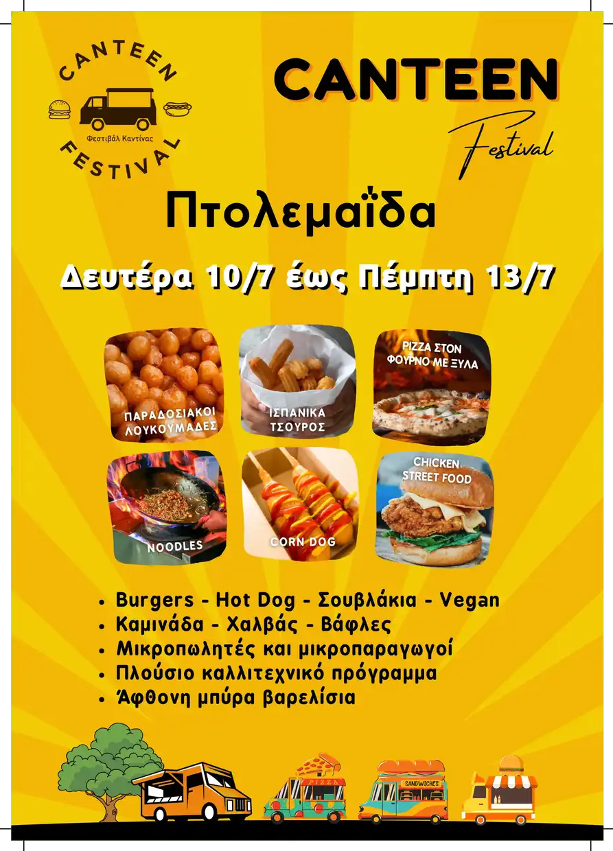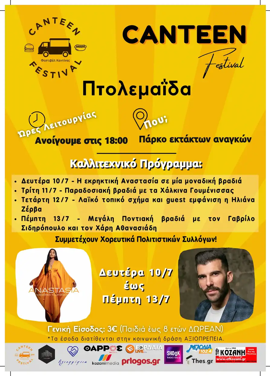 Η Αστική Μη Κερδοσκοπική Εταιρία «Κοινωνία & Πολιτισμός» με τον διακριτικό τίτλο «Thessaloniki Brand» ,σε συνεργασία με το δήμο Εορδαίας , διοργανώνει  το Φεστιβάλ Καντίνας – Canteen Festival με τη συμμετοχή καντινών, μικροπωλητών, μικροπαραγωγών, καθώς και τοπικών φορέων, στο Πάρκο Εκτάκτων Αναγκών στην Πτολεμαΐδα. Η διάρκεια του φεστιβάλ είναι τέσσερις (4) ημέρες, από τις 10 έως τις 13 Ιουλίου.