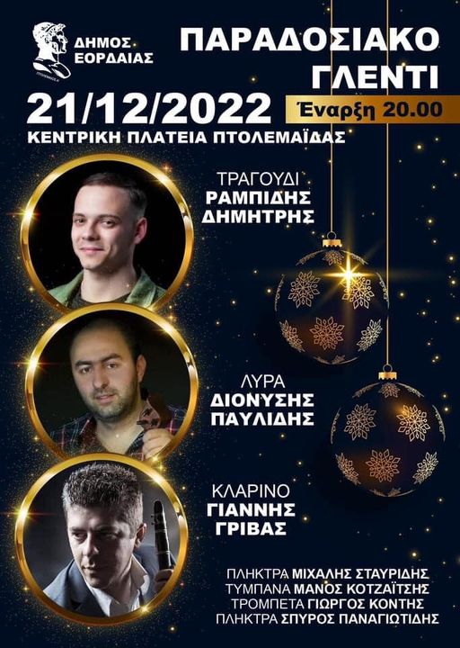 Με παραδοσιακό γλέντι στην Κεντρική Πλατεία της Πτολεμαΐδας, με γνωστούς ντόπιους καλλιτέχνες, συνεχίζονται το βράδυ της Τετάρτης οι χριστουγεννιάτικες εκδηλώσεις “Νιφάδα…τι Πτολεμαείδες”, που διοργανώνει ο Δήμος Εορδαίας σε συνεργασία με πολιτιστικούς και λοιπούς φορείς του Δήμου για την περίοδο των εορτών, οι οποίες θα ολοκληρωθούν ανήμερα των Θεοφανείων.
