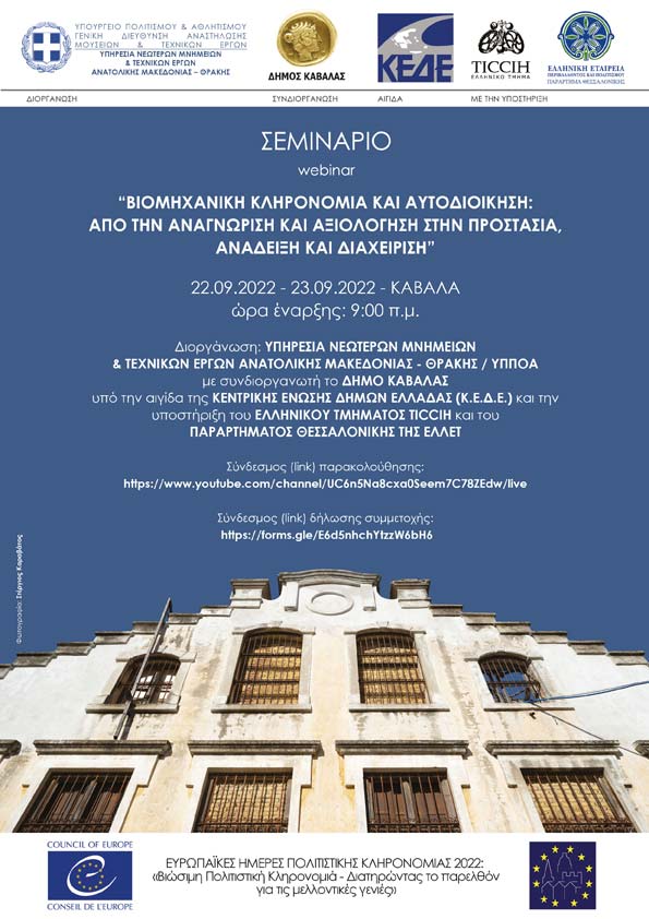 Η Υπηρεσία Νεωτέρων Μνημείων & Τεχνικών Έργων Ανατολικής Μακεδονίας – Θράκης (ΥΝΜΤΕΑΜΘ), του Υπουργείου Πολιτισμού & Αθλητισμού (ΥΠΠΟΑ), στο πλαίσιο του εορτασμού των Ευρωπαϊκών Ημερών Πολιτιστικής Κληρονομιάς (ΕΗΠΚ) 2022 – «Βιώσιμη Πολιτιστική Κληρονομιά – Συντηρώντας το παρελθόν για τις μελλοντικές γενιές», υπό την αιγίδα της Κεντρικής Ένωσης Δήμων και Κοινοτήτων (Κ.Ε.Δ.Ε.), συνδιοργανωτή το Δήμο Καβάλας και την υποστήριξη του Ελληνικού Τμήματος TICCIH και της Ελληνικής Εταιρείας Περιβάλλοντος και Πολιτισμού – Παραρτήματος Θεσσαλονίκης, διοργανώνει webinar με θέμα: «Βιομηχανική Κληρονομιά και Αυτοδιοίκηση: από την αναγνώριση και αξιολόγηση στην προστασία, ανάδειξη και διαχείριση» στις 22 – 23 Σεπτεμβρίου 2022, στην Καβάλα.