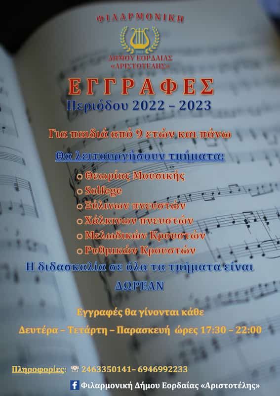 Οι εγγραφές γίνονται κάθε Δευτέρα – Τετάρτη – Παρασκευή από τις 17:30 ως τις 22:00, στον χώρο της Φιλαρμονικής (ημιυπόγειο του δημαρχείου Πτολεμαΐδας).