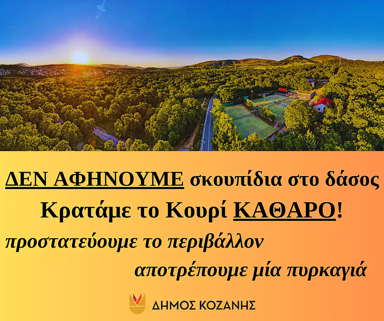 Ο Δήμος Κοζάνης επισημαίνει την ανάγκη προστασίας της πολύτιμής μας φύσης, καλώντας τους πολίτες να ΜΗΝ αφήνουν σκουπίδια σε δασικές εκτάσεις αφού πέρα από την προφανή περιβαλλοντική ζημιά του οικοσυστήματος, υπάρχει μεγάλη πιθανότητα εκδήλωσης μίας πυρκαγιάς με καταστροφικές οικολογικές συνέπειες, λόγω κινδύνου ανάφλεξης των απορριμμάτων, ιδίως τη θερινή περίοδο που διανύουμε.