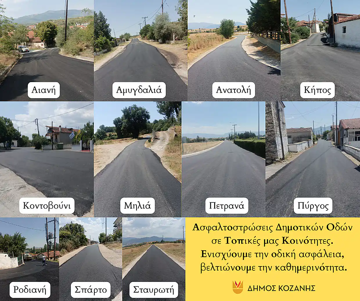 Εκτεταμένες εργασίες οδοποιίας σε χωριά του Δήμου Κοζάνης, πραγματοποιήθηκαν το τελευταίο χρονικό διάστημα από τη Διεύθυνση Τεχνικών Υπηρεσιών, στο πλαίσιο εκτέλεσης του εν εξελίξει έργου «Συντήρηση Δημοτικών Οδών Κοινοτήτων (Πλην Πόλης Κοζάνης)», περιλαμβάνοντας ασφαλτοστρώσεις σε δημοτικές οδούς εντός των οικισμών, με γνώμονα την ενίσχυση της οδικής ασφάλειας και τη βελτίωση της καθημερινότητας.
