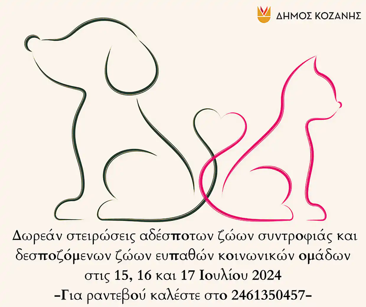 Στο πλαίσιο αυτό ο Δήμος καλεί όσους πολίτες μεριμνούν για τη σίτιση αδέσποτου ζώου συντροφιάς και επιθυμούν να στειρωθεί ο αδέσποτος σκύλος ή η γάτα που φροντίζουν, να επικοινωνήσουν στο τηλέφωνο του Δήμου 2461350457, ώστε να ενημερωθούν σχετικά και να προγραμματίσουν ραντεβού.