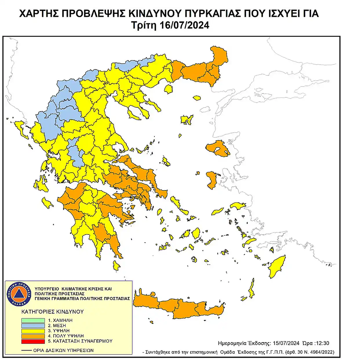 Η Πολιτική Προστασία του Δήμου Κοζάνης ενημερώνει τους δημότες ότι σύμφωνα με τον χάρτη πρόβλεψης κινδύνου πυρκαγιάς, που εκδίδει καθημερινά η Γενική Γραμματεία Πολιτικής Προστασίας, για αύριο Τρίτη 16 Ιουλίου 2024, προβλέπεται υψηλός κίνδυνος πυρκαγιάς (κατηγορία κινδύνου 3 – κίτρινο) σε όλες τις περιοχές του Δήμου Κοζάνης.