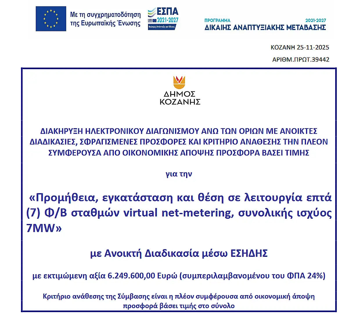 Ειδικότερα, το έργο με τίτλο «Προμήθεια, εγκατάσταση και θέση σε λειτουργία επτά (7) Φ/Β σταθμών virtual net-metering, συνολικής ισχύος 7MW», προϋπολογισμού 6.249.600,00 Ευρώ (συμπεριλαμβανομένου του ΦΠΑ 24%) και αριθμό μελέτης 256/2025 της ΔΤΥ Δήμου Κοζάνης, βρίσκεται ήδη σε ανοιχτό δημόσιο ηλεκτρονικό διαγωνισμό, τον οποίο προκήρυξε ο Δήμαρχος Κοζάνης Γιάννης Κοκκαλιάρης. Σύμφωνα με την προκήρυξη, ο διαγωνισμός για την ανάδειξη αναδόχου θα γίνει την Παρασκευή 16 Ιανουαρίου 2026 ενώ καταληκτική ημερομηνία υποβολής των προσφορών είναι η Δευτέρα 12 Ιανουαρίου 2026 και ώρα 14:00 το μεσημέρι. Η χρηματοδότηση του έργου προέρχεται από το Επιχειρησιακό Πρόγραμμα «ΔΙΚΑΙΗ ΑΝΑΠΤΥΞΙΑΚΗ ΜΕΤΑΒΑΣΗ 2021-2027» και από το Ειδικό Αναπτυξιακό Πρόγραμμα (ΕΑΠ 2017-2021), με φορέα υλοποίησης τον Δήμο Κοζάνης.