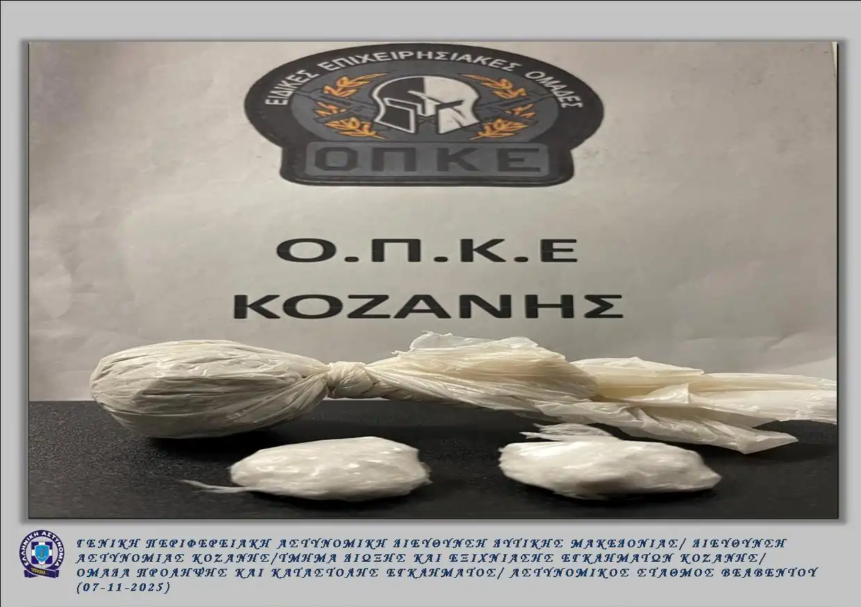 Συνελήφθη το απόγευμα της Πέμπτης 6 Νοεμβρίου 2025 σε περιοχή της Κοζάνης, από αστυνομικούς της Ομάδας Πρόληψης και Καταστολής Εγκλήματος (Ο.Π.Κ.Ε.) του Τμήματος Δίωξης και Εξιχνίασης Εγκλημάτων Κοζάνης, σε συνεργασία με τον Αστυνομικό Σταθμό Βελβεντού, ένας 41χρονος άνδρας για κατοχή ναρκωτικών ουσιών.
