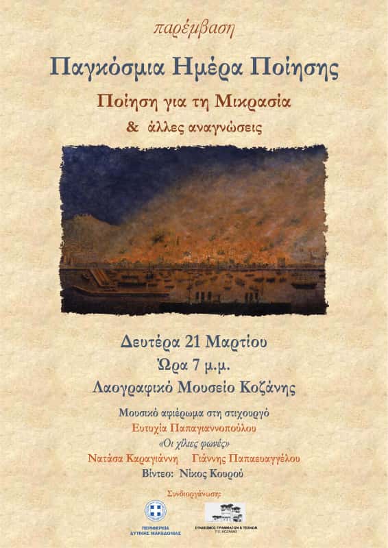Η Παρέμβαση γιορτάζει την Παγκόσμια Ημέρα Ποίησης με ένα αφιέρωμα στην ποίηση που γράφτηκε για τη Μικρασία, αλλά και με ελεύθερες αναγνώσεις. Η εκδήλωση θα πραγματοποιηθεί σε συνδιοργάνωση με την Περιφέρεια Δυτικής Μακεδονίας και τον Σύνδεσμο Γραμμάτων και Τεχνών Κοζάνης, την Δευτέρα 21 Μαρτίου 2022, ώρα 7 μ.μ. στο Λαογραφικό Μουσείο Κοζάνης.