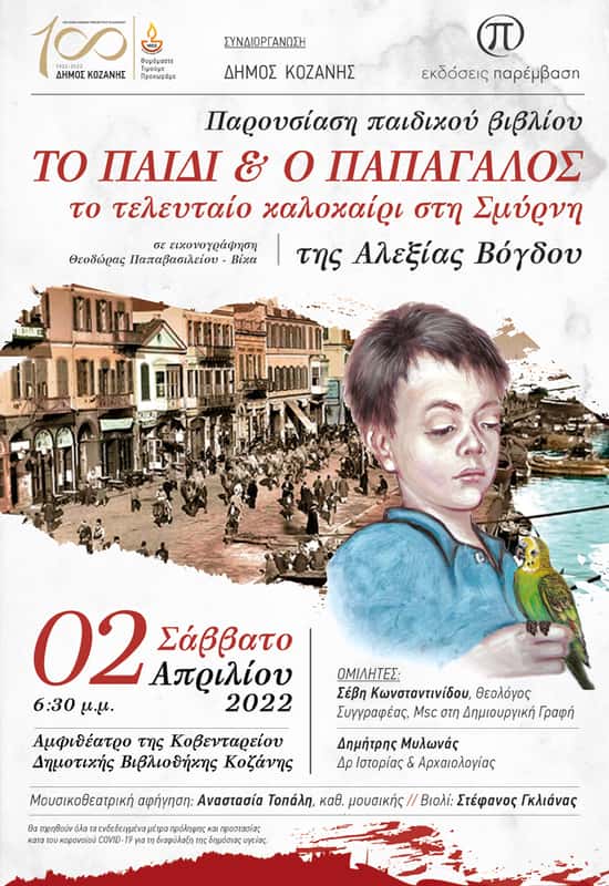 Στο πρόγραμμα εκδηλώσεων του Δήμου Κοζάνης για τα 100 χρόνια μνήμης Προσφυγικού Ελληνισμού, εντάσσεται η παρουσίαση του παιδικού βιβλίου της Αλεξίας Βόγδου, «Το παιδί και ο παπαγάλος, το τελευταίο καλοκαίρι στη Σμύρνη», σε συνεργασία με τις εκδόσεις Παρέμβαση.