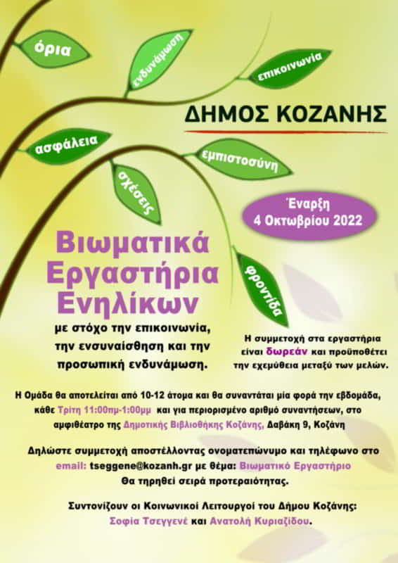 Η συμμετοχή στα εργαστήρια του Δήμου Κοζάνης είναι δωρεάν και προϋποθέτει την εχεμύθεια μεταξύ των μελών. Θα τηρηθεί σειρά προτεραιότητας.
