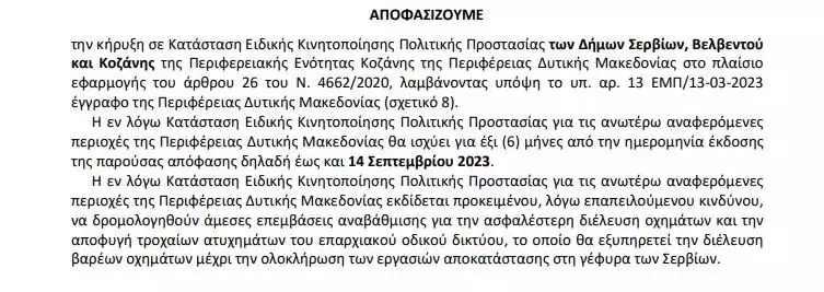 Μέχρι και 14 Σεπτεμβρίου αποφασίστηκε η Κήρυξη σε Κατάσταση Ειδικής Κινητοποίησης Πολιτικής Προστασίας των Δήμων Σερβίων, Βελβεντού και Κοζάνης με αφορμή το θέμα στην Υψηλή Γέφυρα των Σερβίων