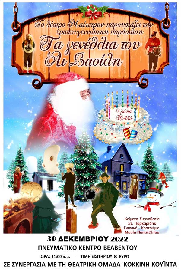 Το Θέατρο «Μαίωτρον», σε συνεργασία με την «Κόκκινη Κουίντα», παρουσιάζουν την Παρασκευή 30 Δεκεμβρίου 2022, στις 11:00 το πρωί, στο Πνευματικό κέντρο Βελβεντού, την χριστουγεννιάτικη παιδική παράσταση «ΤΑ ΓΕΝΕΘΛΙΑ ΤΟΥ ΑΙ ΒΑΣΙΛΗ », σε κείμενο και σκηνοθεσία Σταύρου Παρχαρίδη.