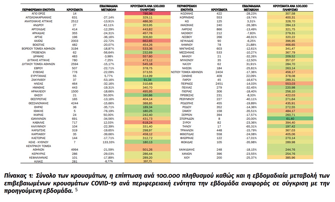 Κατανομή κρουσμάτων την εβδομάδα αναφοράς: Στο Πίνακα 1 παρουσιάζεται τo σύνολο των κρουσμάτων, η επίπτωση ανά 100.000 πληθυσμού καθώς και η εβδομαδιαία μεταβολή των επιβεβαιωμένων κρουσμάτων COVID-19 ανά περιφερειακή ενότητα την εβδομάδα αναφοράς σε σύγκριση με την προηγούμενη εβδομάδα.
