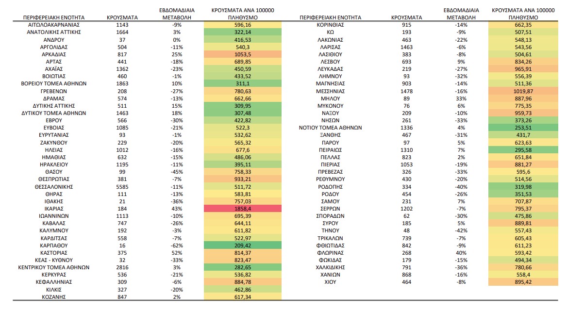 Κατανομή κρουσμάτων την εβδομάδα αναφοράς: Στο Πίνακα 1 παρουσιάζεται τo σύνολο των κρουσμάτων, η επίπτωση ανά 100.000 πληθυσμού καθώς και η εβδομαδιαία μεταβολή των επιβεβαιωμένων κρουσμάτων COVID-19 ανά περιφερειακή ενότητα την εβδομάδα αναφοράς σε σύγκριση με την  προηγούμενη εβδομάδα.