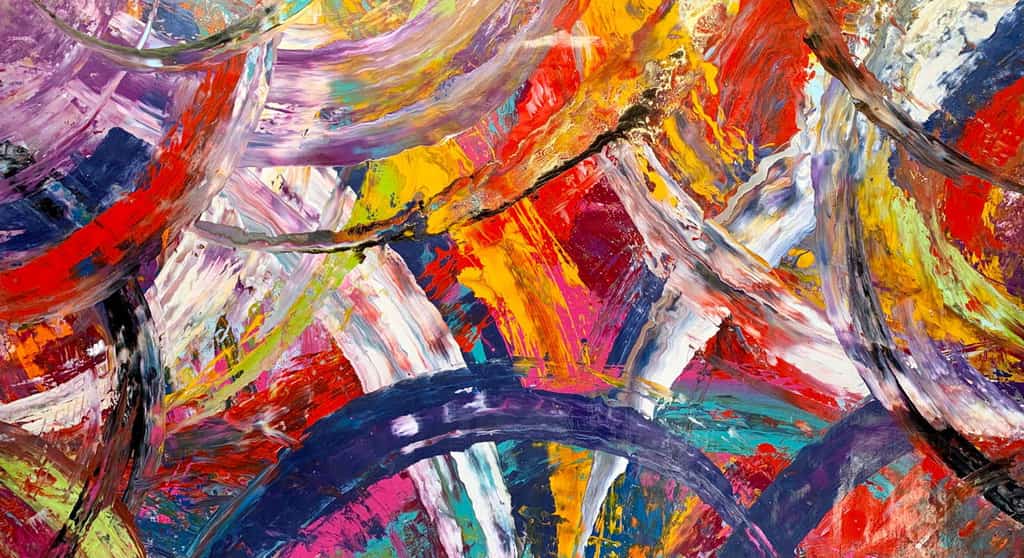 Rangwali Holi is a large multi-coloured abstract painting that celebrates the Indian (Hindu) festival of spring