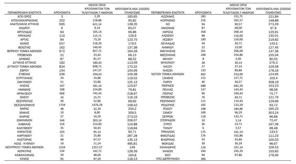 Με βάση τα επιβεβαιωμένα κρούσματα των τελευταίων 7 ημερών, 286 θεωρούνται σχετιζόμενα με ταξίδι από το εξωτερικό και 2.163 είναι σχετιζόμενα με ήδη γνωστό κρούσμα.