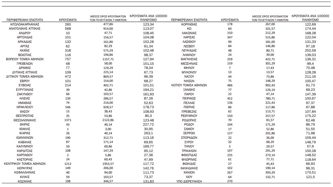 Τα νέα εργαστηριακά επιβεβαιωμένα κρούσματα της νόσου που καταγράφηκαν τις τελευταίες 24 ώρες  είναι 12.462 , εκ των οποίων 24 εντοπίστηκαν κατόπιν ελέγχων στις πύλες εισόδου της χώρας. Ο συνολικός αριθμός των κρουσμάτων ανέρχεται σε 2.788.654 (ημερήσια μεταβολή +0.4%), εκ των οποίων 49.3% άνδρες. Με βάση τα επιβεβαιωμένα κρούσματα των τελευταίων 7 ημερών, 177 θεωρούνται σχετιζόμενα με ταξίδι από το εξωτερικό και 1.685 είναι σχετιζόμενα με ήδη γνωστό κρούσμα.