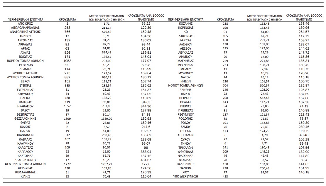 Ημερήσιος αριθμός και κρούσματα ανά 100.000 πληθυσμού επιβεβαιωμένων εγχώριων κρουσμάτων COVID-19 ανά περιφερειακή