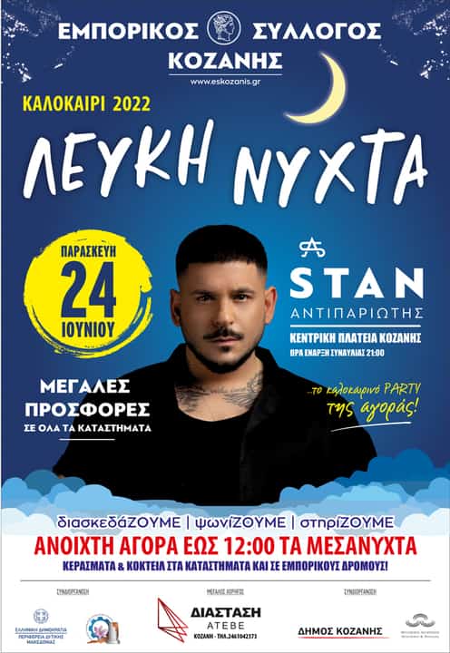 Ο Εμπορικός Σύλλογος Κοζάνης κατανοώντας απόλυτα την αγωνία όλων των συναδέλφων αλλά και την ανάγκη όλου του κόσμου να βγεί από το σπίτι του, να κάνει τη βόλτα με την οικογένειά του και να διασκεδάσει κάνοντας παράλληλα τις αγορές του διοργανώνει την Παρασκευή 24-06-2022 την «ΛΕΥΚΗ ΝΥΧΤΑ ΤΟΥ ΚΑΛΟΚΑΙΡΙΟΥ».
