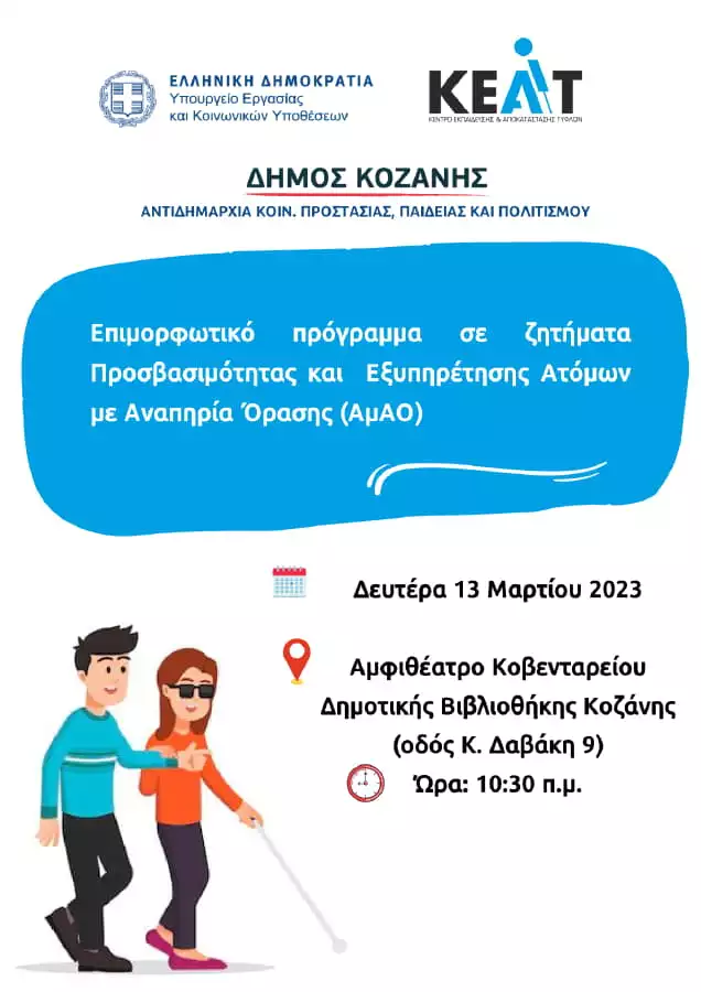 Η Αντιδημαρχία Κοινωνικής Προστασίας, Παιδείας και Πολιτισμού του Δήμου Κοζάνης σε συνεργασία με το Κέντρο Εκπαίδευσης και Αποκατάστασης Τυφλών, διοργανώνουν επιμορφωτικό πρόγραμμα σε ζητήματα προσβασιμότητας και εξυπηρέτησης ατόμων με αναπηρία όρασης, τη Δευτέρα 13 Μαρτίου 2023 και ώρα 10.30, στο Αμφιθέατρο της Κοβενταρείου Δημοτικής Βιβλιοθήκης Κοζάνης, οδός Κ. Δαβάκη 9 .