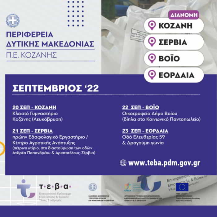 Η Περιφερειακή Ενότητα Κοζάνης ως επικεφαλής εταίρος της Κοινωνικής Σύμπραξης ΤΕΒΑ που έχει συσταθεί για το Νομό μας ανακοινώνει ότι θα πραγματοποιηθεί, σε συνεργασία με τους Δήμους Κοζάνης, Βοίου, Εορδαίαςς, Σερβίων και Βελβεντού, διανομή τροφίμων του «Επιχειρησιακού Προγράμματος Επισιτιστικής και Βασικής Υλικής Συνδρομής ΤΕΒΑ» στους δικαιούχους των οποίων οι αιτήσεις έχουν τρία μέλη και πλέον, τις παρακάτω ημέρες :