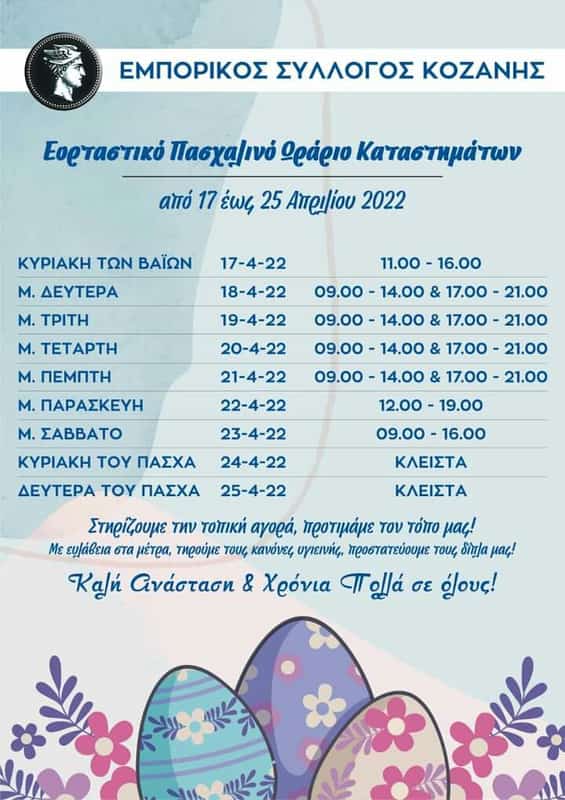 Ο Εμπορικός Σύλλογος Κοζάνης ενημερώνει εργαζόμενους και  καταναλωτικό κοινό το εορταστικό Πασχαλινό ωράριο των καταστημάτων.