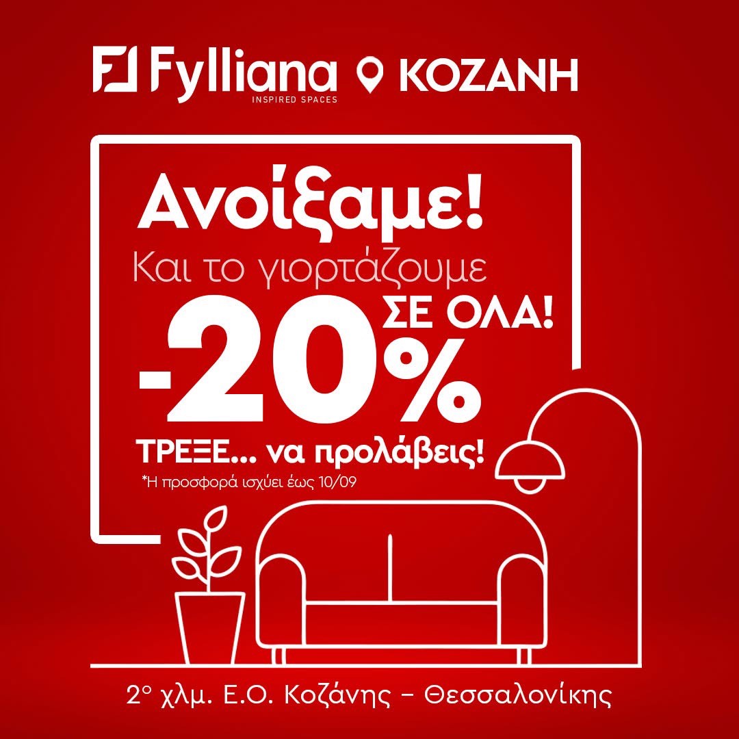 Το κατάστημα Fylliana στην Κοζάνης ανακοινώνει προσφορές - 20% σε όλα τα είδη έως τις 10 Σεπτεμβρίου