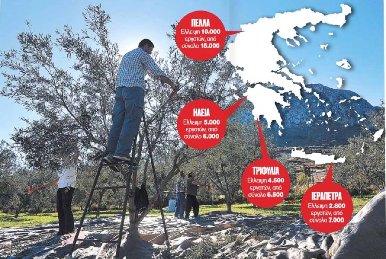 Σε ό,τι αφορά τον Νομό Ηλείας, χρειάζονται γύρω στους 6.000 εργάτες, ενώ – στα χαρτιά – υπάρχουν περίπου 1.000 άτομα, σύμφωνα με τον πρόεδρο Αγροτικού Συνεταιρισμού Πύργου Μιχάλη Πλαστουργό. Από την πλευρά του, ο πρόεδρος του Αγροτικού Συλλόγου Φιλιατρών Αγγελής Κοροβίλας αναφέρει πως αυτή τη στιγμή οι περισσότεροι διαθέσιμοι εργάτες στερούνται εγγράφων και δεν εφικτό να τους «νομιμοποιήσουν». «Εχουμε κάνει αιτήσεις για να έρθουν μετακλητοί εργάτες γης από Ινδία και Πακιστάν και ακόμα δεν έχει γίνει τίποτα. Προσωπικά εγώ χρειάζομαι 15 άτομα και έχω μείνει με πέντε» αναφέρει χαρακτηριστικά. Στην περιοχή της Τριφυλίας χρειάζονται γύρω στις 4.500 νόμιμους εργάτες, αλλά οι περισσότεροι από αυτούς που δούλευαν στην περιοχή τα προηγούμενα χρόνια έφυγαν για την Ισπανία και την Ιταλία. Επιπλέον, ο Αγγελής Κοροβίλας καταγγέλλει πως «υπάρχουν καταγγελίες εργατών για πρεσβείες στις οποίες αν δεν πληρώσουν κάποιο ποσό οι ίδιοι οι εργάτες που έχουν προσκληθεί, δεν τους επιτρέπουν να ταξιδέψουν στην Ελλάδα».