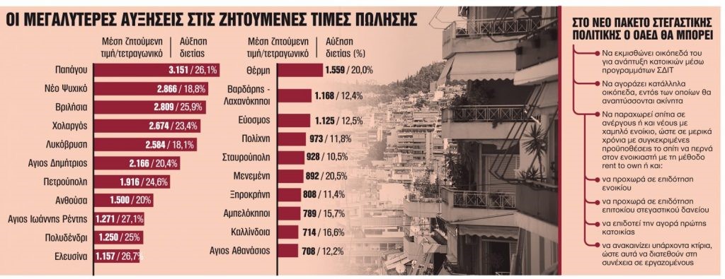 Ετσι, στο μυαλό της κυβέρνησης για την επανεκκίνηση της στεγαστικής πολιτικής είναι η αξιοποίηση της ακίνητης περιουσίας της ΔΥΠΑ περιλαμβάνει την εκμίσθωση ακινήτων, την ανοικοδόμηση με δαπάνες του μισθωτή, τη δυνατότητα αγοράς ακινήτων από τη ΔΥΠΑ, αλλά και τη σύμπραξη με δημόσιους και ιδιωτικούς φορείς για την ανέγερση νέων ακινήτων. Σε πρώτο πλάνο για να δοθούν μπαίνουν 200 οικόπεδα, 100 κτίρια και 100 κενά καταστήματα που βρίσκονται στην κατοχή του πρώην ΟΑΕΔ. Στο νέο πακέτο στεγαστικής πολιτικής φέρεται να περιλαμβάνεται η δυνατότητα του Οργανισμού: