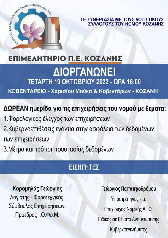 Στο πλαίσιο της επιμόρφωσης των μελών του, το Επιμελητήριο Κοζάνης σε συνεργασία με τους Λογιστικούς Συλλόγους του νομού Κοζάνης, διοργανώνει δωρεάν ημερίδα για τις επιχειρήσεις  με θέματα: