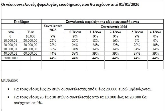Ο Πίνακας με τους νέους συντελεστές φορολόγησης εισοδήματος που έδωσε στην δημοσιότητα το ΥΠΕΘΟ.