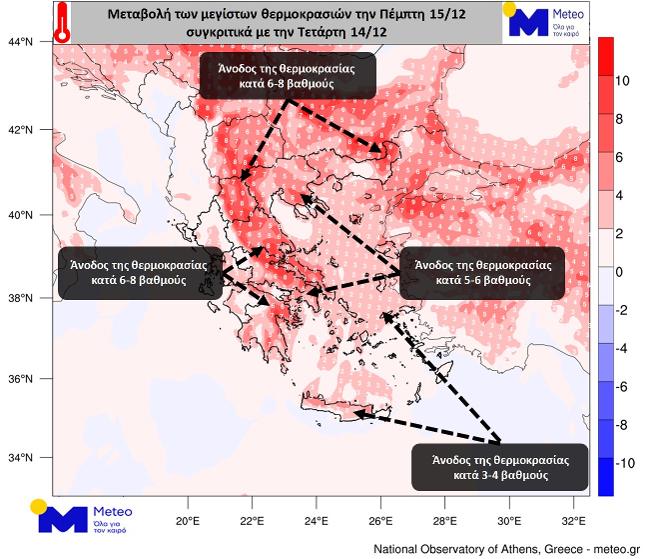 Σύμφωνα με τα νεότερα προγνωστικά στοιχεία του Εθνικού Αστεροσκοπείου Αθηνών / Meteo.gr, αισθητή άνοδο θα σημειώσει η θερμοκρασία την Πέμπτη 15/12 σε ολόκληρη τη χώρα.