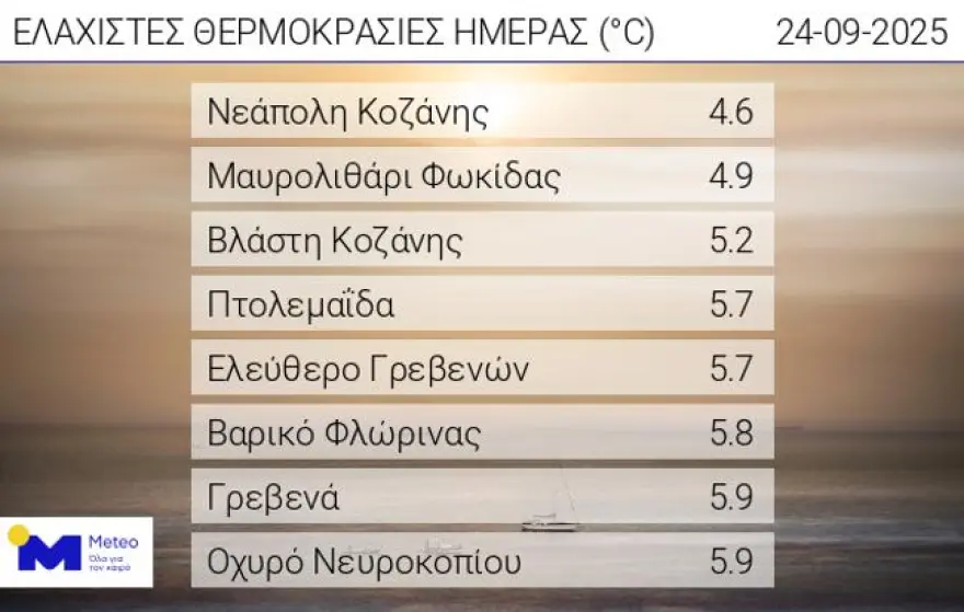 Μονοψήφιες ελάχιστες θερμοκρασίες σημειώθηκαν τις πρωινές ώρες της Πέμπτης 25/09 στα κεντρικά και βόρεια ηπειρωτικά τμήματα, αλλά και στα οροπέδια της Κρήτης, με τη χαμηλότερη ελάχιστη θερμοκρασία να καταγράφεται στο Τζερμιάδο Λασιθίου με 5,1 °C. Σύμφωνα με το δίκτυο αυτόματων μετεωρολογικών σταθμών του Εθνικού Αστεροσκοπείου Αθηνών / meteo.gr, οι οκτώ χαμηλότερες ελάχιστες θερμοκρασίες τις πρωινές ώρες της Πέμπτης 25/09 παρουσιάζονται στον παρακάτω πίνακα.