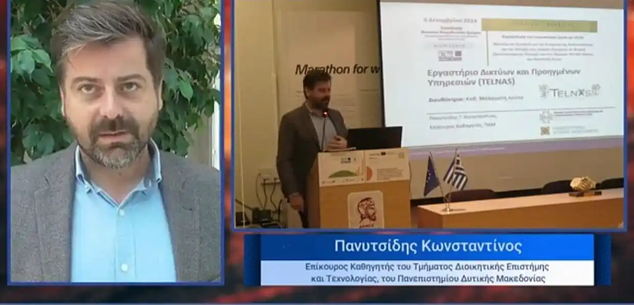Έπειτα, ο κ. Κωνσταντίνος Πανυτσίδης, Επίκουρος Καθηγητής του Πανεπιστημίου Δυτικής Μακεδονίας και αναπληρωτής επιστημονικός υπεύθυνος του έργου, παρουσίασε την εισήγησή του με τίτλο: «Η Συμβολή του Εργαστηρίου Δικτύων και Προηγμένων Υπηρεσιών (TELNAS) στην Έρευνα και Καινοτομία για τη Βιώσιμη Ανάπτυξη και την Περιβαλλοντική Ανθεκτικότητα», αναδεικνύοντας τη σημασία του έργου στην ενίσχυση της ανθεκτικότητας των δασικών περιοχών μέσω καινοτόμων εργαλείων που συμβάλλουν στην πρόληψη και προστασία των δασών.