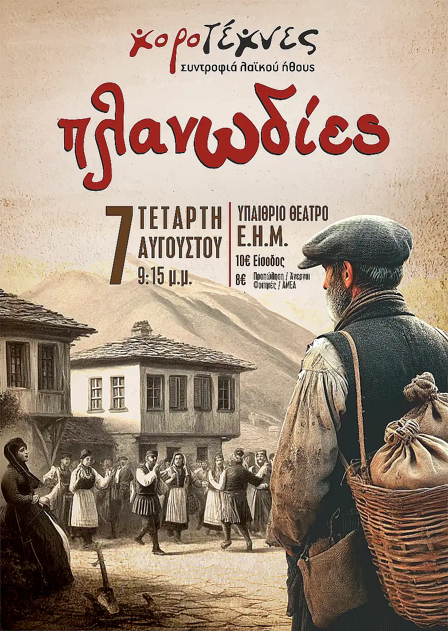 Το καλλιτεχνικό σωματείο παραδοσιακών χορών Χοροτέχνες – συντροφιά λαϊκού ήθους Ιωαννίνων παρουσιάζει τη μουσικοχορευτική περιπλάνηση με τίτλο Πλανωδίες, την Τετάρτη 7 Αυγούστου και ώρα 21:15, στο υπαίθριο θέατρο της Εταιρείας Ηπειρωτικών Μελετών.