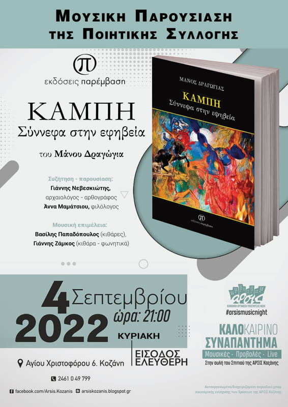 Σας καλούμε, την Κυριακή 4 Σεπτεμβρίου, 21:00, στην αυλή της ΑΡΣΙΣ Κοζάνης, στη μουσική παρουσίαση της ποιητικής συλλογής του Μάνου Δραγώγια «Καμπή-σύννεφα στην εφηβεία», από τις εκδόσεις Παρέμβαση.