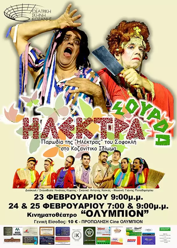Η Θεατρική Σκηνή Κοζάνης, δίνει το παρόν στην φετινή Αποκριά, με την παρωδία της «Ηλέκτρας» του Σοφοκλή στο Κοζανίτικο Ιδίωμα, «ΗΛΕΚΤΡΑ Σούρδα», στις 23 με μία παράσταση στις 09:00 μ.μ., και στις 24 και 25 Φεβρουρίου με δύο παραστάσεις στις 7:00 και 9:00 μ.μ., στο κινηματοθέατρο «ΟΛΥΜΠΙΟΝ».