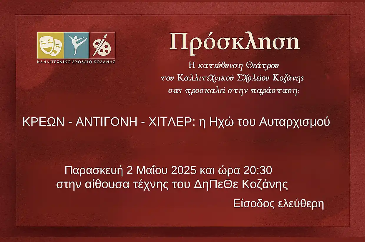 Το Καλλιτεχνικό Σχολείο Κοζάνης σας προσκαλεί στην παράσταση: «Κρέων – Αντιγόνη – Χίτλερ: Η Ηχώ του Αυταρχισμού» την Παρασκευή 2 Μαΐου, στην Αίθουσα Τέχνης του ΔΗ.ΠΕ.ΘΕ. Κοζάνης ώρα 20:30