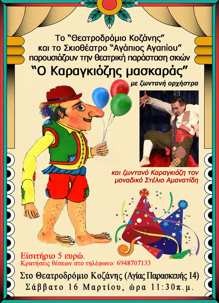 Το Θεατροδρόμιο Κοζάνης σε συνεργασία με το Σκιοθέατρο του εξαιρετικού καραγκιοζοπαίχτη Αγάπιο Αγαπίου παρουσιάζει την παράσταση «Ο Καραγκιόζης…Μασκαράς».
