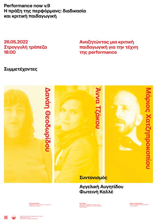 Στο πλαίσιο του Performance now v.9 που πραγματοποιείται από το Τμήμα Εικαστικών και Εφαρμοσμένων Τεχνών του Πανεπιστημίου Δυτικής Μακεδονίας (www.uowm.gr ), θα διεξαχθεί την Πέμπτη 26 Μαΐου και ώρα 18:00, στρογγυλή τράπεζα με τίτλο Αναζητώντας μια κριτική παιδαγωγική για την τέχνη της performance.